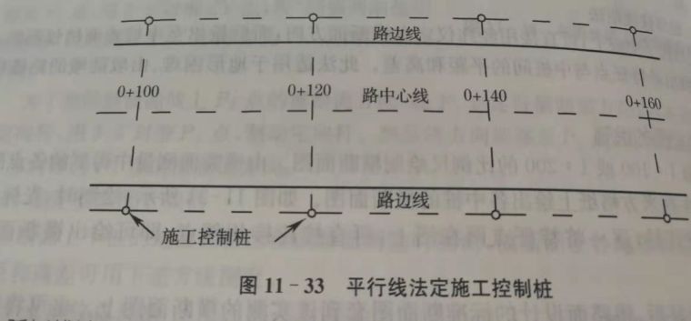 由于道路中线桩在施工中要被挖掉或堆埋,为了在施工中控制中线位置,需要在不易受施工破坏、便于引测、易于保存桩位的地方测设施工控制桩。测设方法有平行线法和延长线法。