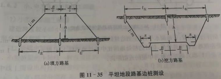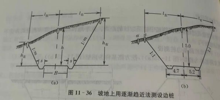 如图11-36(a)所示,在坡地上测设路基边桩,从图上可以看出,左、右边桩离中桩的距离为
