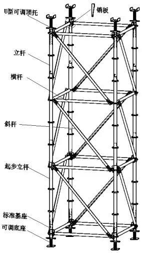 安装搭设盘扣式支撑架时,应先安装立杆,再安装水平杆,最后安装斜杆,形成了基本的架体单元后,再以此扩展搭设成整体的支架体系。