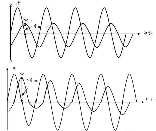 在正常稳态下:在稳态时铁心中的磁通滞后外加电压900(电感上的电流落后外加电压900)磁通平稳见图