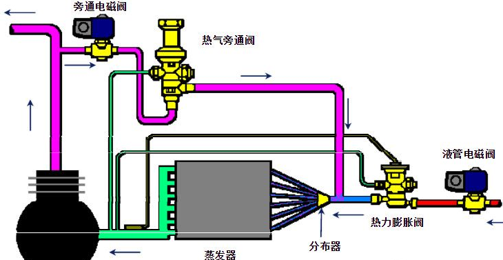 (2)如果压缩机位于蒸发器的上部,热气旁通至蒸发器时必须确保在低负荷旁通量的工况下 ,压缩机有充足的回油量。