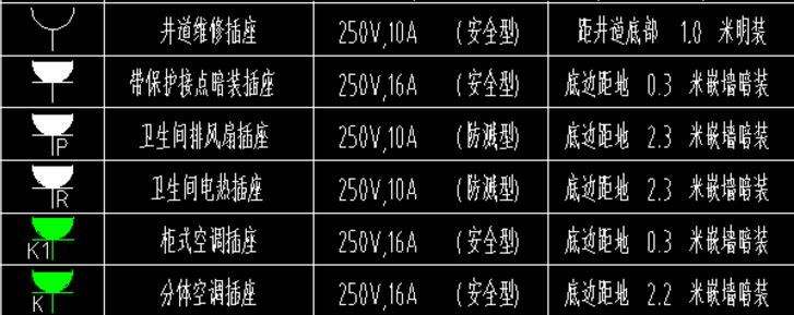 各种插座的用途不同,安装高度自然也就不同。常见的普通插座的设计高度为0.3米,柜式空调插座0.3米,挂式空调插座2.3米,卫生间热水器插座2.3米,洗衣机插座1.5米,厨房插座1.5米。