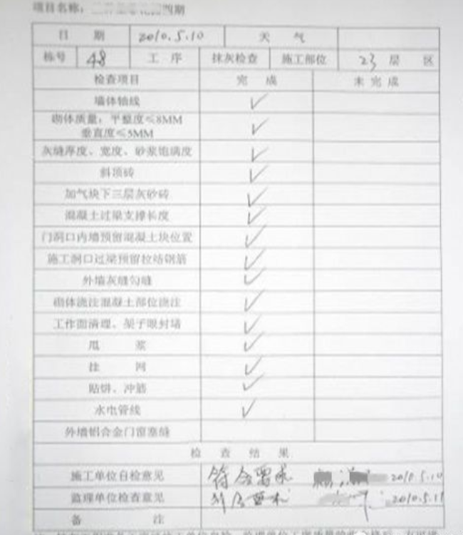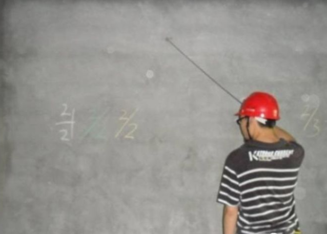 22 抹灰完成后,总包、监理、甲方实测结果分别用白、蓝、红色粉笔标注在墙面上。