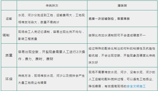 通过对比发现,使用专用砂浆做薄抹灰,有助于节能减排和资源综合利用,促进节约型社会的建设,有助于确保工程质量提高施工效率,减轻劳动强度,促进文明施工,有助于降低施工现场噪音和扬尘污染,减轻城市环境压力,及促进经济与环境协调可持续发展等方面都有着积极的意义。