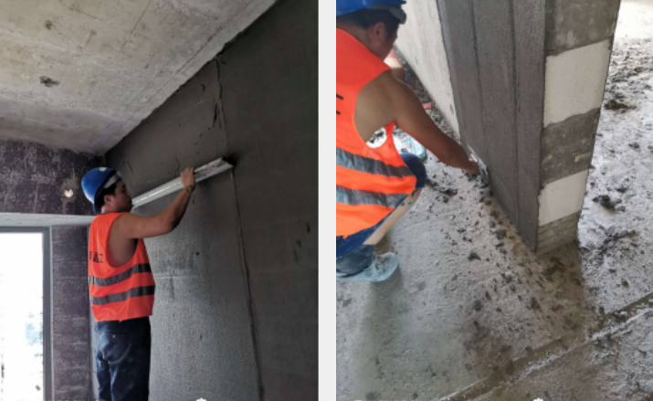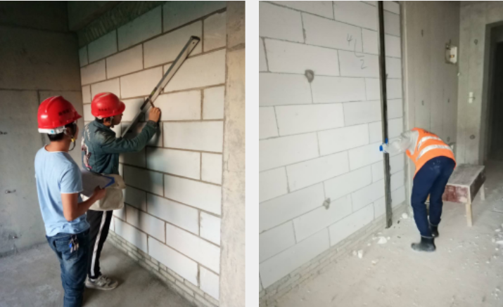 (1)垂直度:用红外线激光仪对砌筑好的墙面进行垂直度检查,要求垂直度误差在5mm内。