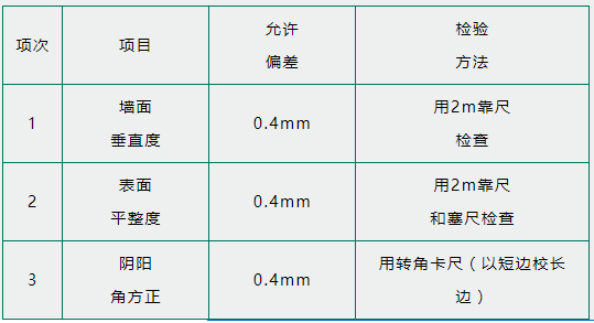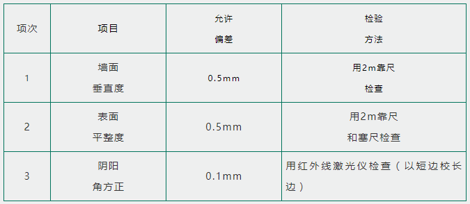 (3)方正性:用阴阳角尺或用红外线激光仪套出墙体方正性,要求方正性误差在10mm内。