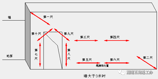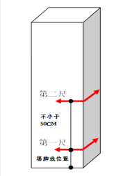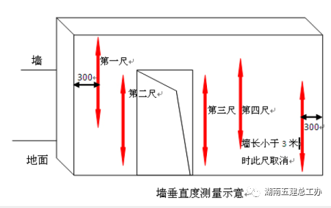 (2)当墙长度小于3米时,同一面墙距两端头竖向阴阳角约30cm位置,分别按以下原则实测2次:一是靠尺顶端接触到上部砼顶板位置时测1次垂直度,二是靠尺底端接触到下部地面位置时测1 次垂直度;