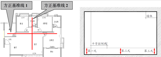 (2)每套房同层内必须设置一条方正控制基准线(尽量通长设置,降低引测误差),且同一套房同层内的各测区(即各房间)必须采用此方正控制基准线,然后以此为基准,引测至各测区(即各房间);