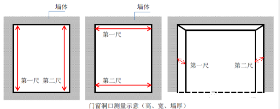 (3)实测最好在施工完地面找平层后,同一个户内门洞口尺寸沿宽度、高度各测2次。若地面找平层未做,则从现场一米标高线测量并计算实测户内门洞口高度2次。高度2个测量值与设计值之间偏差的最大值,作为高度偏差的1个实测值;宽度的2个测量值与设计值之间偏差的最大值,作为宽度偏差的1个实测值;墙厚则左、右边各测量一次,2个测量值与设计值之间偏差的最大值,作为墙厚偏差的1个实测值。每个门洞的高度、净宽、墙体厚度的3个实测值中,有任何一个超出评判标准,则3个实测值均不合格。