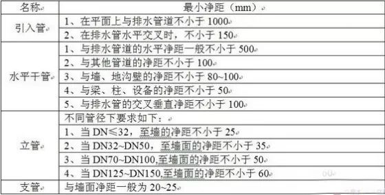 给水引入管管顶上部净空一般不小于100mm排水排出管管顶上部净空一般不小于150mm