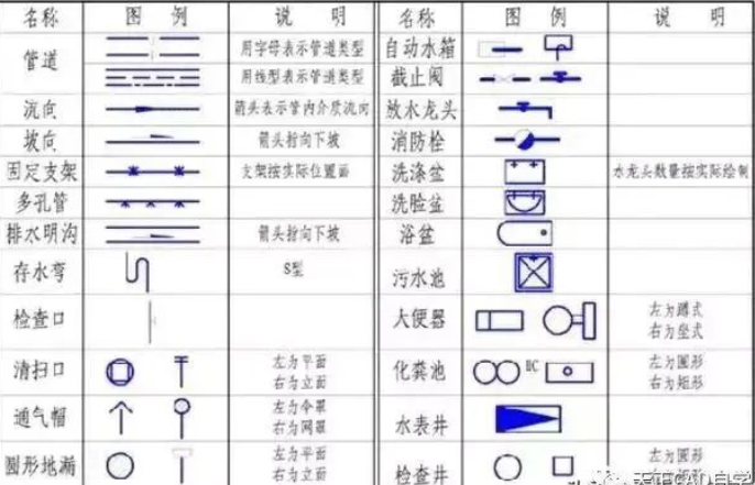 根据建筑规划,在设计图纸中,用水设备的种类、数量、位置,均要作出给水和排水平面布置;各种功能管道、管道附件、卫生器具、用水设备,如消火栓箱、喷头等,均应用各种图例表示;各种横干管、立管、支管的管径、坡度等,均应标出。平面图上管道都用单线绘出,沿墙敷设时不注管道距墙面的距离。