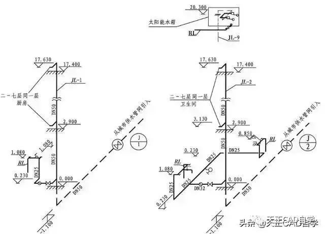 4、图纸没有特别说明,一般情况下:给水管标注的是管道中心标高,排水管标注的是管道底标高。