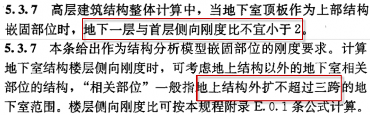 图3 抗规条文说明对地下室顶板嵌固剪切刚度比的要求