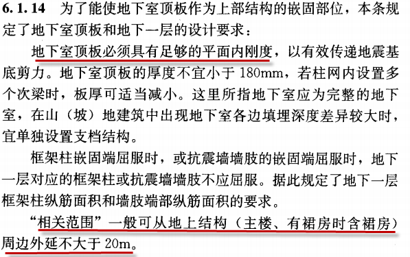 抗规对结构地下室顶板嵌固的剪切刚度比的计算,要求地上一层侧向刚度与地下一层相关范围侧向刚度比不宜大于0.5。抗规地下一层相关范围一般取地上结构周边外延不大于20m的地下室范围。