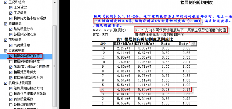 通过上述的分析可以看到,剪切刚度计算比较简单,软件按照抗规要求,自动进行楼层剪切刚度比的计算和控制,对于不满足地下室顶板嵌固的会显红提示超限。