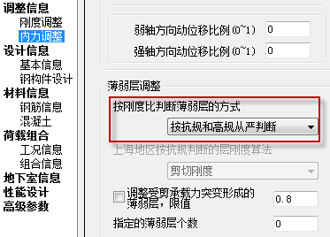 另外由于高规和抗规对判断薄弱层的层剪力与层间位移的刚度比计算是不完全相同的,对于框架结构是完全一致的,但是对非框架结构,高规要在抗规的基础上考虑层高修正。这就需要对非框架结构,还要选择如何进行刚度比的控制,如图15所示,软件默认的情况是刚度比控制按抗规和高规从严控判断,设计师也可选择按抗规或高规执行刚度比的控制。
