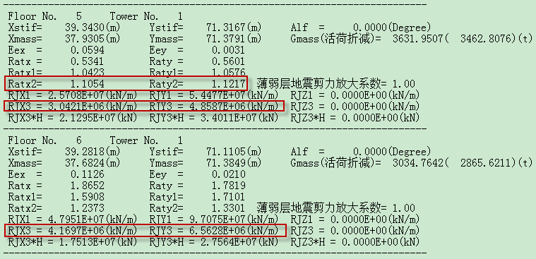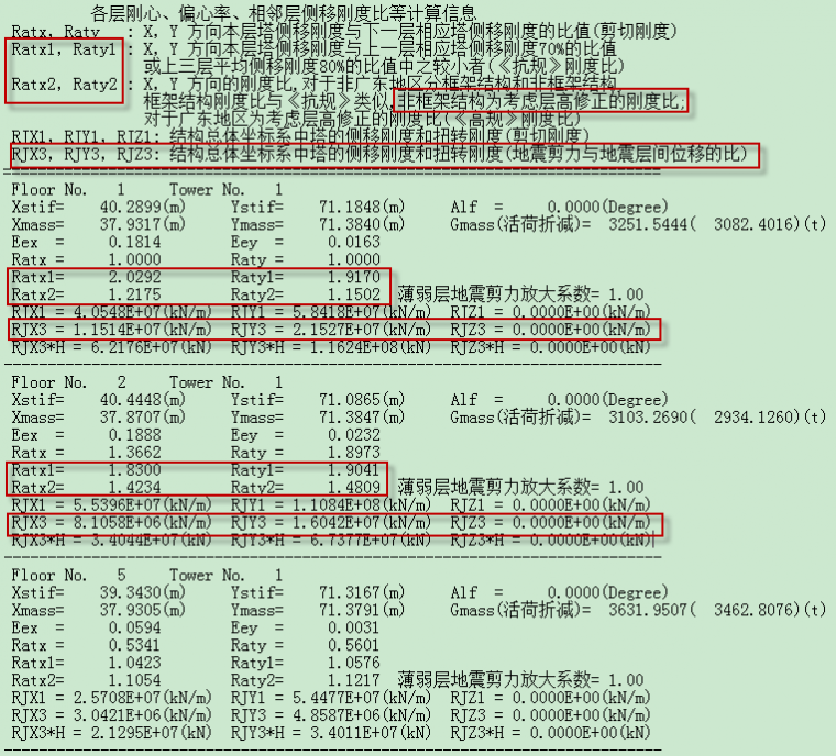Ratx2,Raty2 分别为:X,Y 方向的刚度比,对于非广东地区分框架结构和非框架结构,框架结构刚度比与《抗规》类似,非框架结构为考虑层高修正的刚度比;对于广东地区为考虑层高修正的刚度比(《高规》刚度比)。