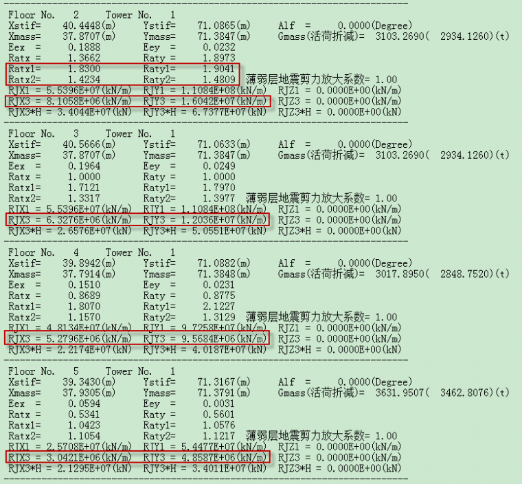 旧版wmass.out中输出的计算书中,对于楼层剪力与楼层位移直接计算的刚度写为RJX3和RJY3,但是对刚度比是做了区分的,区分了框架结构的刚度比及非框架结构的刚度比,框架结构的刚度比记为Ratx1和Raty1;对于非框架结构的刚度比记为Ratx2和Raty2。