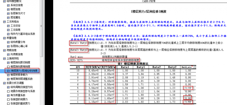 注意:软件输出的该刚度比已经考虑了与上层90%的比值,因此,在刚度比能否满足规范要求的判断时,直接与1去比较。