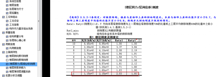 由于该结构是框剪结构,选择按照抗规与高规从严控制刚度比,因此,在控制时要同时满足Ratx1、Raty1及Ratx2、Raty2。
