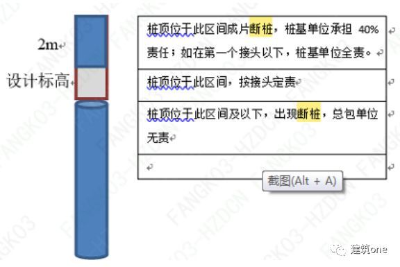 桩顶位于此区间成片断桩,桩基单位承担40%责任;如在第一个接头以下,桩基单位全责。桩顶位于此区间,按接头定责桩顶位于此区间及以下,出现断桩,总包单位无责。