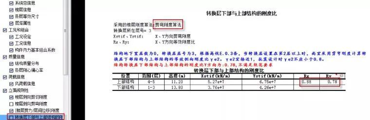 (2)对高位转换结构楼层剪力与位移的刚度比输出及校核。