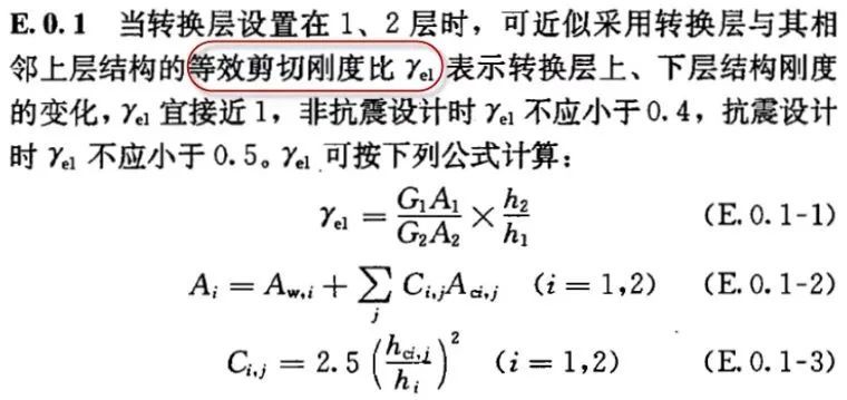 也就是说对低位转换结构,转换层与相邻上层的刚度比要按照剪切刚度控制,但是低位转换结构其他楼层的刚度比还是要按照正常结构的层剪力与层间位移计算的刚度控制刚度比,仍然要按照Rat1与Rat2取较小值从严控制。