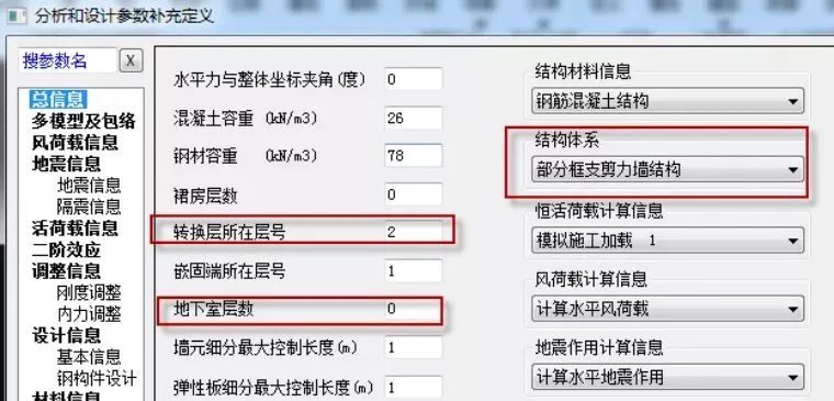 如果指定结构为部分框支转换结构,指定转换层所在的层号及地下室层数,如图28所示,软件根据转换层所在的层号减去地下室层数,判断该结构是否是低位转换结构,如果是低位转换结构,程序对于转换层与相邻上层的刚度比就使用剪切刚度去判断。