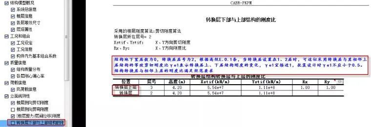 (2)对转换结构楼层剪切刚度比的输出及校核。