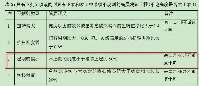 住房城乡建设部在2015年印发了《超限高层建筑工程抗震设防专项审查技术要点》,其中对于超限结构的认知,如图34所示,也要求进行刚度比的控制,本层侧向刚度小于相邻上层的50%时,属于层刚度偏小。