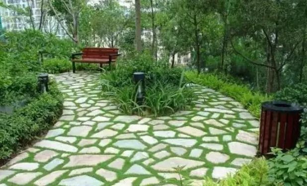 施工时,先在整平压实的路基上铺垫一层栽培壤土作垫层。壤土要求比较肥沃,不含粗颗粒物,铺垫厚度根据实际情况定。然后在垫层上浇筑60厚素砼垫层,采用30厚1∶2.5水泥砂浆座浆,铺砌符合人的行走习惯的不等边麻石糙面汀步,垫层与石块之间的夹缝中半填壤土,并播种草籽或贴上草块中踩实。