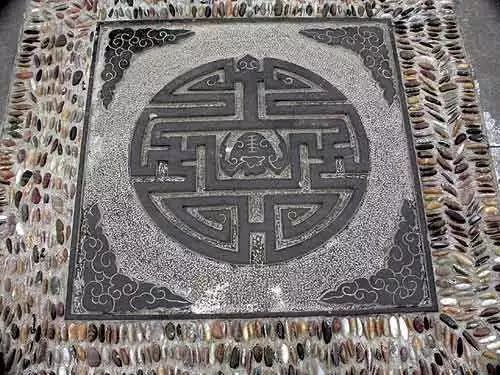施工前,要根据设计的图样,准备镶嵌地面用的砖石材料,设计有精细图形的,先要在细密质地青砖上放好大样,再精心雕刻,作好雕刻花砖,施工中嵌入铺地图案中。要精心挑选铺地用石子,挑选出的石子应按照不同颜色、不同大小、不同长扁形状分别堆放,铺地拼花时才能方便使用。施工时,先要在已作好的道路基层上,铺砌一层结合材料,厚度一般可为4cm~7cm之间,根据设计要求采用干法铺筑湿法铺筑。在铺平的松软垫层上,按照预定的图样开始镶嵌拼花,或者拼成不同颜色的色块,以填充图形大面。就可以定形。定形后的铺地地面,仍要用水泥干砂或石灰砂撒布其上,并扫入砖石缝隙中填实。最后,用大水冲击或者使路面有水流淌。完成后,养护7~10d。