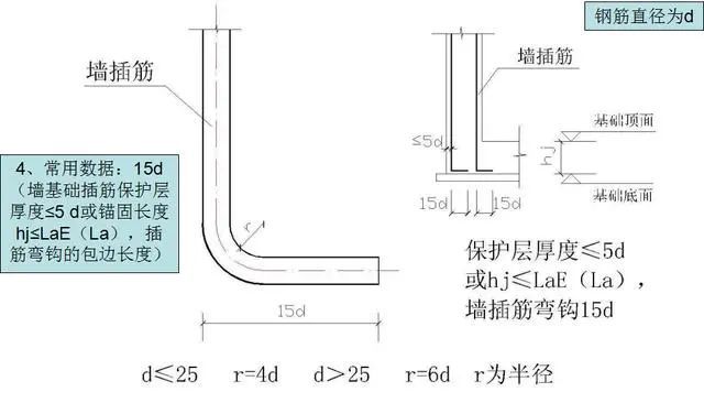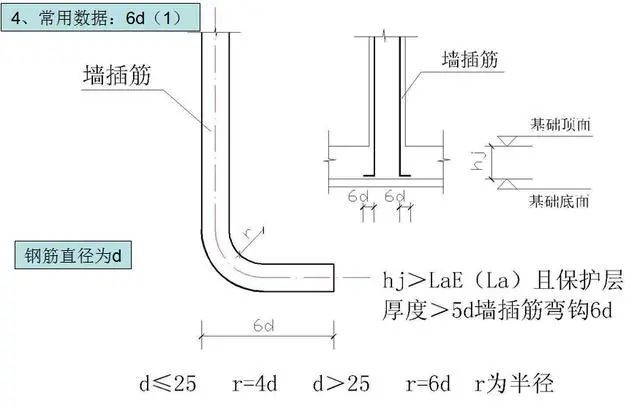 1)墙基础插筋锚固长度hj>LaE(La)且保护层厚度>5d,插筋弯钩的包边长度。