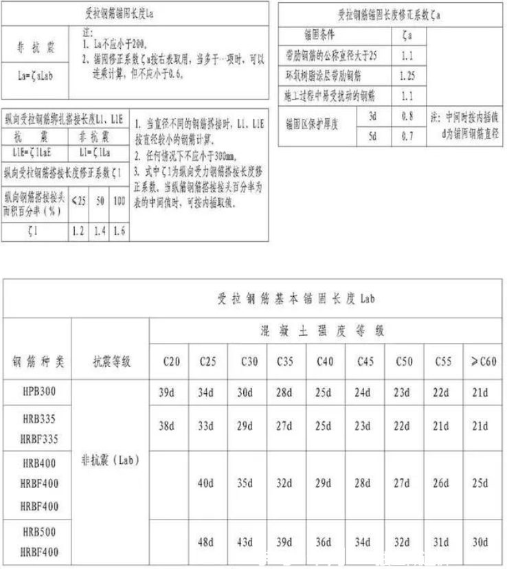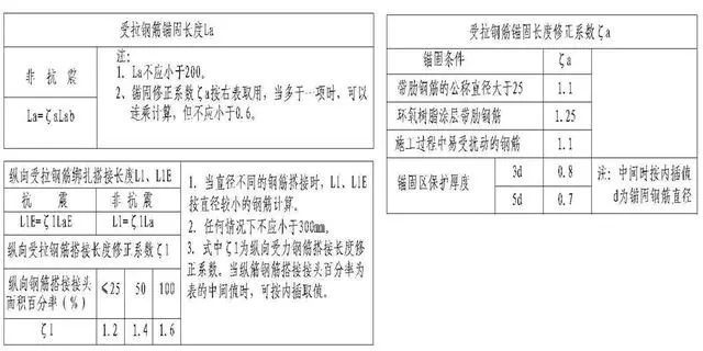 非抗震结构所有构件;抗震结构的L梁(次梁)、XL梁(挑梁)、JZL(井字梁)、板内受拉钢筋的最小锚固长度及最小搭接长度(Ll)的基数(搭接100%:1.6 La;搭接50%:1.4 La;搭接25%:1.2 La)。