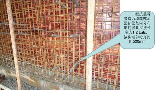 4)剪力墙竖向钢筋比较特殊:绑扎搭接长度1.2 LaE(La),一、二级抗震接头端部错开间距500;机械连接、焊接接头中心错开间距均为35d。