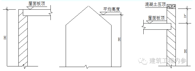 2)平屋面:外墙高度算至钢筋混凝土板顶,如图39所示。山墙高度按其平均高度计算,如图310所示。女儿墙高度自外墙顶面算至混凝土压顶底,如图311所示。