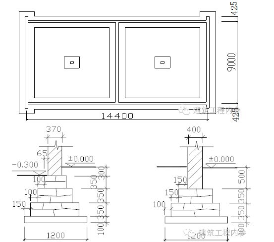 (2)基础大放脚T形接头处的重叠部分以及嵌入基础的钢筋、铁件、管道、基础防潮层、单个面积在0.3m2以内的孔洞所占体积不予扣除,但靠墙暖气沟的挑檐亦不增加,附墙垛基础宽出部分体积并入基础工程量内。