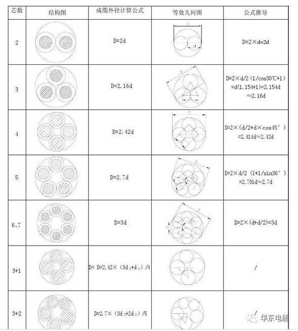 ③、3+1芯 D=2.31(3d大+d小)/4 ④、4等芯 D=2.31d
