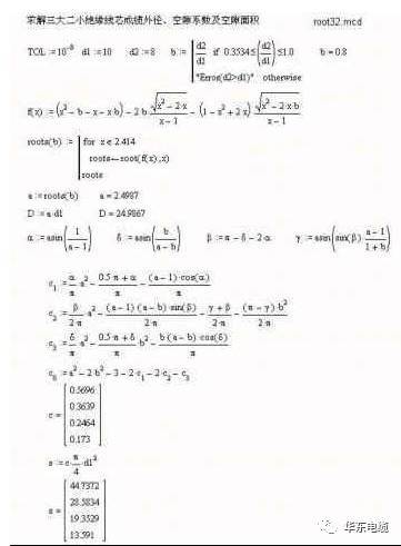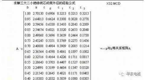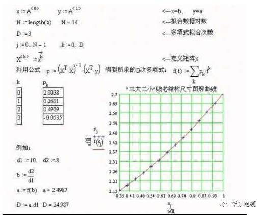 3.计算三大二小线芯结构成缆外径、空隙系数的经验公式 利用计算三大二小线芯结构成缆外径的方法,可以构成与对应表格(见a与b等关系矩阵A),同时利用Mathcad编程语言,进行多项式拟合,即得到计算三大二小线芯结构成缆外径的经验公式。其程序如下: