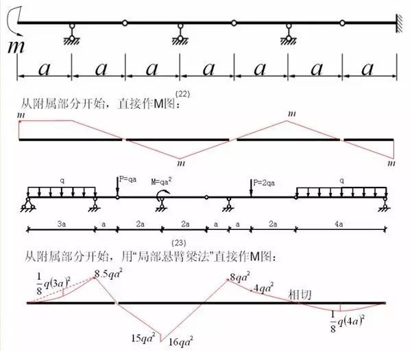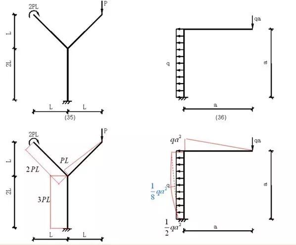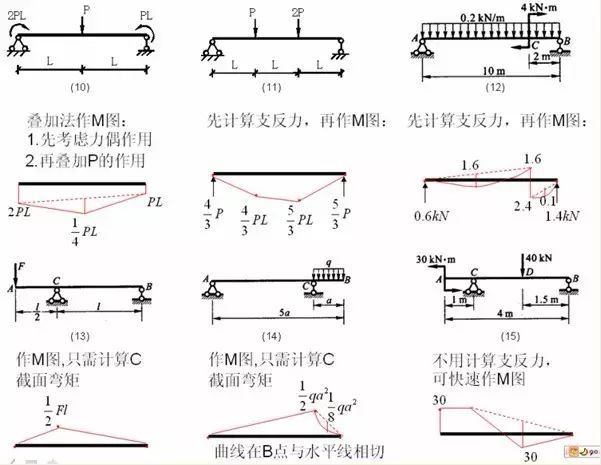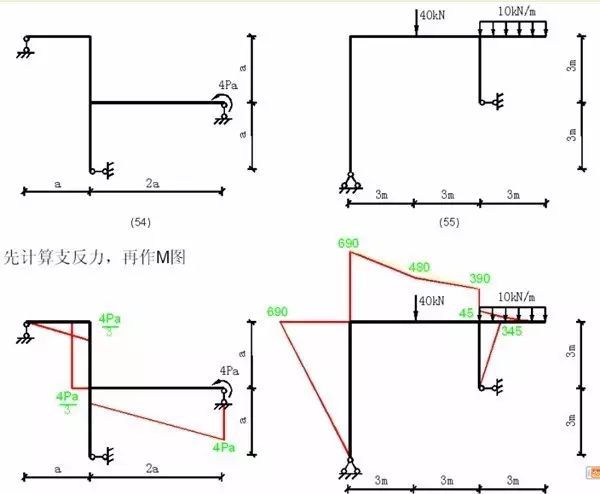 2、对于悬臂式刚架,从自由端开始,按照分段叠加法,逐段求作M图(M图画在受拉一侧);对于其它形式的刚架,从支座端开始,按照分段叠加法,逐段求作M图(M图画在受拉一侧)。