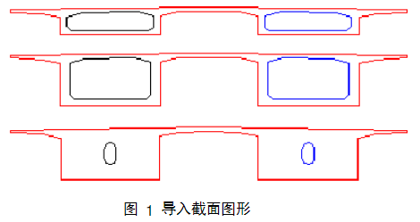 1.绘制截面图形:准备需要输入的截面,在CAD中进行绘制好。如图1所示,图中有3个截面,分3个图层:0图层、1图层、2图层画出,外框与内框颜色设定都不相同,保存的文件名为1.dxf。绘制时有如下规定: