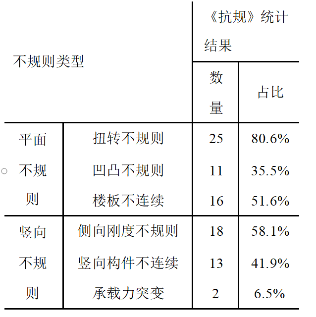 建议将《抗规》表3.4.3-1平面凹进的尺寸大于相应投影方向总尺寸的30%修改为平面凹进的尺寸大于相应投影方向总尺寸的30%,且形成的凸出部位宽度小于相应投影总尺寸的30%。根据本文建议的不规则判别条件,重新对31个超限项目进行判别,扭转不规则项数量可由11个工程减少至8个。