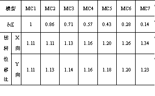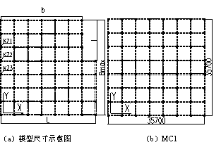 为了研究凹凸部分不同尺寸的情况下对整体结构的影响,建立7个模型进行分析,均采用框架结构,跨距均为5.1m,层高均为4.5m,共12层,平面详图1。每个模型突出长度相同,突出位置宽度逐渐变小,按《抗规》均应判定为凹凸不规则,但从平面直观来看MC2和MC3平面基本完整,似乎可以不归入凹凸不规则。MC2~MC7模型l/Bmax=0.43,凸出部位的宽度与投影尺寸比b/L详见表1。表1列出7个模型的位移比结果。