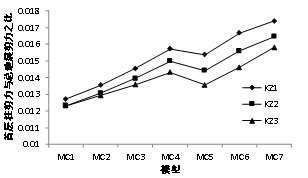 选取图1模型中3根柱进行内力分析。由图2可以看出,平面局部突出导致突出部位柱剪力增大,且伴随b/L缩小,其凹凸部位柱剪力增大加剧,其中模型MC1和模型MC2的凹凸部位柱剪力明显增大,平面局部突出对平面中远离凹凸部位的柱剪力影响较小。表明凹凸面积相对较大,结构平面整体性较好时,凹凸部位对结构整体影响较小,偶然偏心地震下柱剪力放大有限,因此可以在现有规范基础上对凹凸不规则条件进行一定放松。