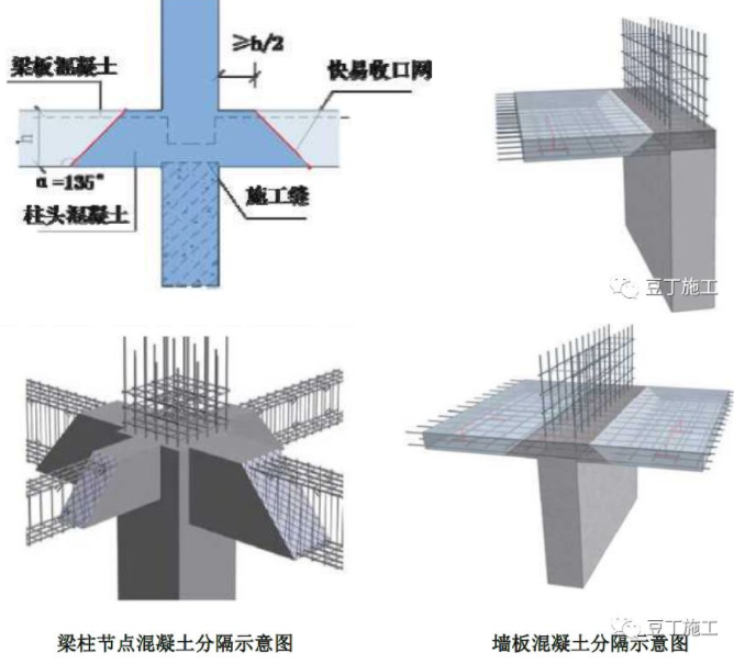 2、梁柱不同强度等级混凝土,采用快易收口网分隔,成 45 度角放置。快易收口网应在梁侧模安装前绑扎完成。