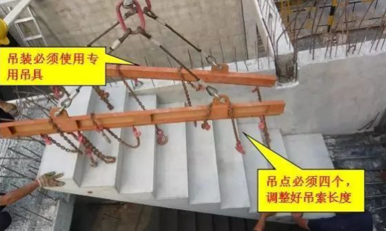 2.4确保在起吊过程中预制梯段休息平台与保持水平状态;采用可调试横吊梁均衡起吊就位,吊点必须在4个或以上。