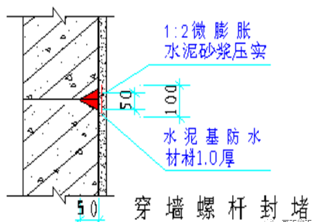 2、外接触面形成50x50左右锥形凹槽,采用微膨胀水泥防水砂浆挤压,填补密实。同时外刷100x100宽1厚JS防水涂料。