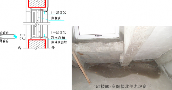 铝合金窗内外窗台高差20mm,外窗台应低于内窗台,外窗台应有20%的向外排水坡度。