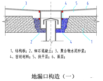 4、施工工序可参考:地漏口周边凿毛清理干净地漏口处板底安装模板地漏口周边湿润,扫水砂浆填筑细石混凝土并留出凹槽地面饰面层施工及养护铺贴地面饰面层凹槽处清理干净并干燥凹槽处嵌填防水油膏。