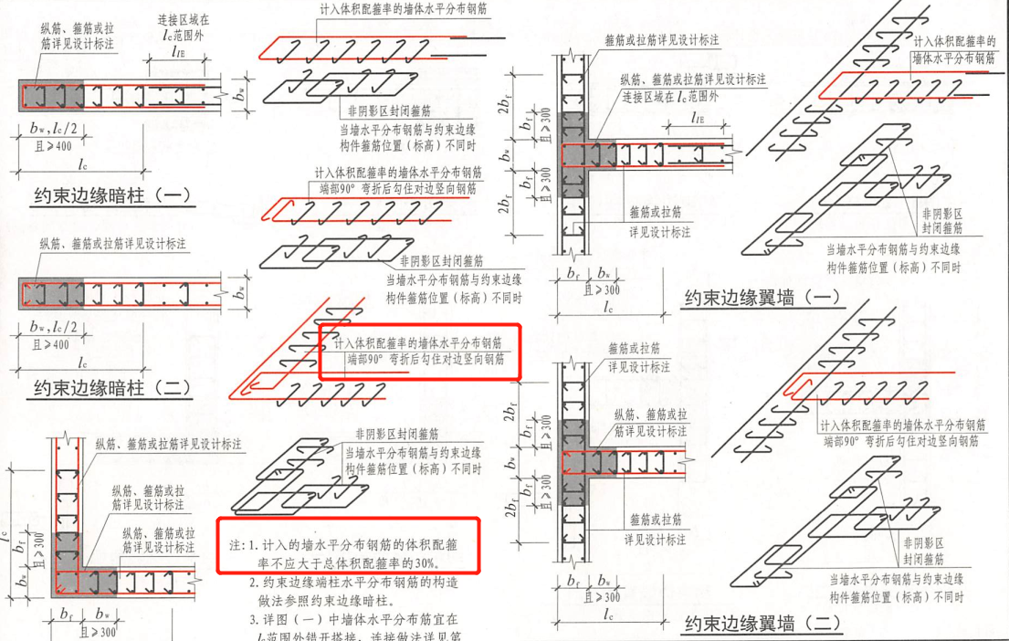 当墙水平分布钢筋与约束边缘构件箍筋位置不同时,计入体积配箍率的墙体水平分布钢筋端部90度弯折后勾住对边竖向钢筋(计入的墙水平分布钢筋的体积配箍率不应大于总体积配箍率的30%)